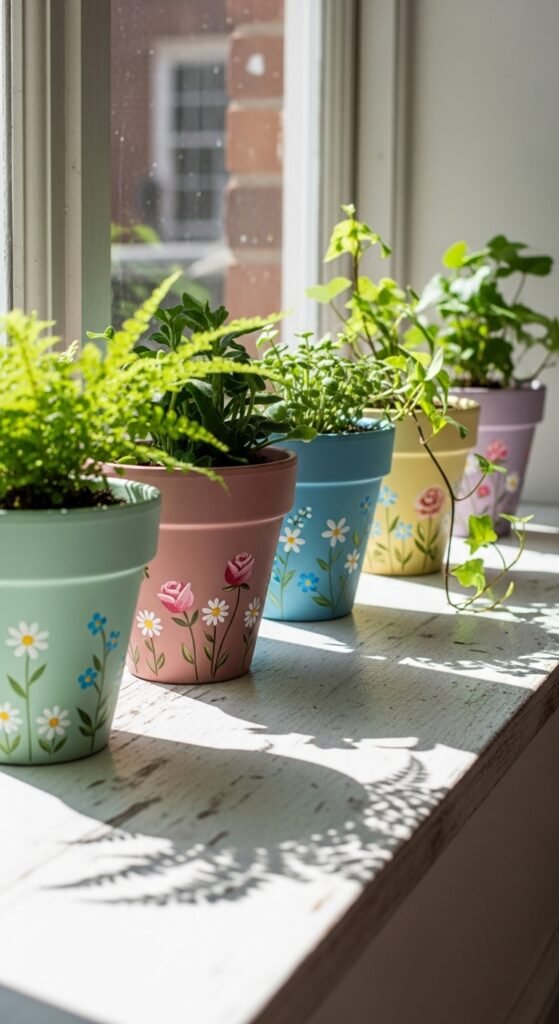 Bring some color to your home with painted flower pots. Pick up some terracotta pots from a garden store and let your creativity run wild with acrylic paints. You can paint patterns like polka dots, stripes, or even a simple floral design. Once your pots are dry, plant some spring flowers or herbs like lavender or basil. This project is perfect for adding a personal touch to your garden or indoor plants. Plus, it’s an affordable way to spruce up your space!