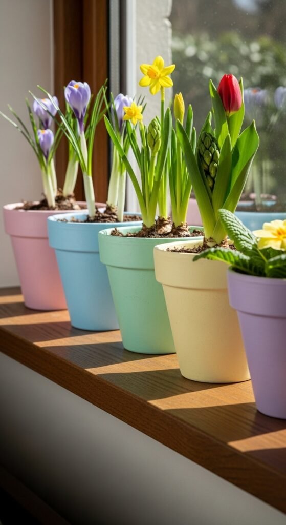 [Image Prompt: Tin cans painted in soft pastels and filled with small spring plants, arranged on a windowsill with sunlight highlighting the colors.]