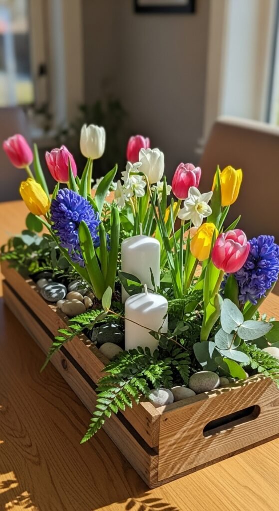 Use old wooden crates or thrifted boxes as table centerpieces. Fill them with flowers, candles, or seasonal fruits. Add moss, pebbles, or small branches for texture. These crates can be painted or left natural for a rustic touch. Layering different heights within the crate instantly adds sophistication. They’re perfect for dining tables, coffee tables, or even outdoor patios.