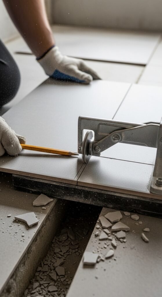 Once you reach the edges or any outlets, you’ll need to cut tiles to fit. Measure the remaining spaces and use a tile cutter or wet saw to cut the tiles to the right size. Take your time with this step, as precision is key to ensuring a polished finish.