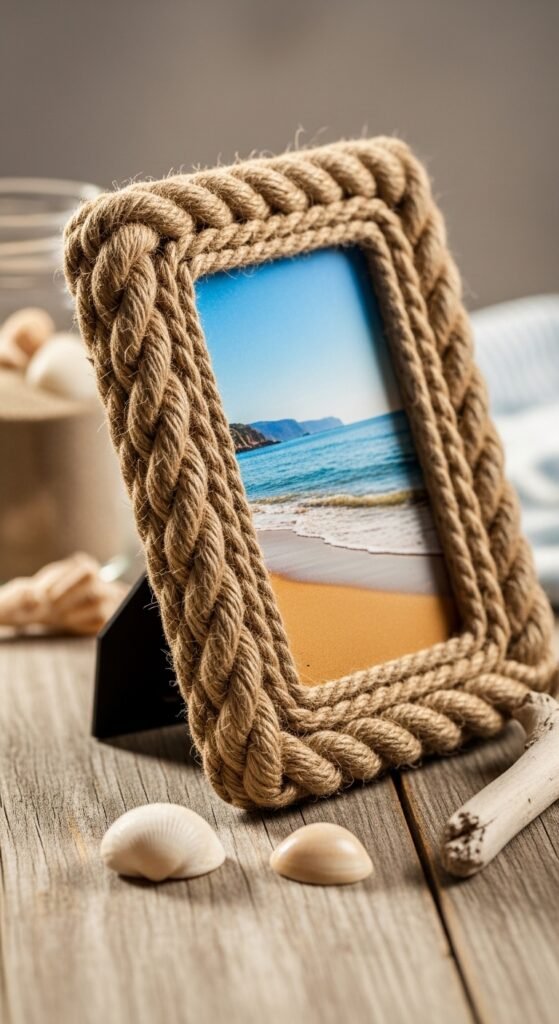 A simple and impactful way to bring rope into your decor is by wrapping a picture frame with it. This easy DIY project creates a rustic yet chic look for your favorite photos, perfect for a coastal living room or farmhouse entryway.