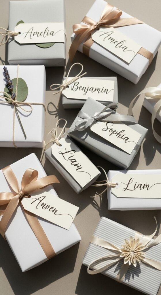 [Image Prompt: Elegant printable wedding favor tags attached to small boxes with silk ribbon, neutral palette, soft lighting, high-end photography.]